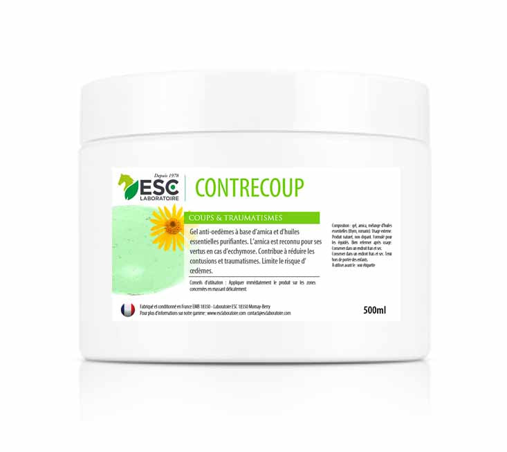 Contrecoup ist ein Anti-Ödem-Gel für Pferde auf der Basis von Arnika und reinigenden ätherischen Ölen. Arnika ist für seine Anti-Bluterguss-Eigenschaften bekannt. Dieses Gel hilft, Blutergüsse und Traumata zu reduzieren und das Risiko von Ödemen zu begrenzen.