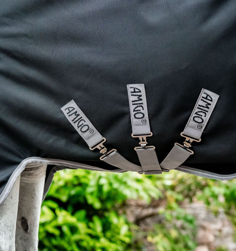 Notre système de fermeture en V fiable et facile à utiliser, notre encolure Surefit et notre coupe arrondie au niveau des membres permettent à votre cheval de se déplacer et de paître sans entrave, tandis que la conception à trois surfaix croisés, le rabat de queue et la courroie de queue offrent un ajustement optimal et confortable. Un couvre-cou amovible est inclus pour plus de flexibilité et des bandes réfléchissantes pour une meilleure visibilité lors des sorties, des rentrées ou des contrôles nocturnes à la lumière d'une lampe torche. Amigo® répond à vos besoins et à ceux de votre cheval !
