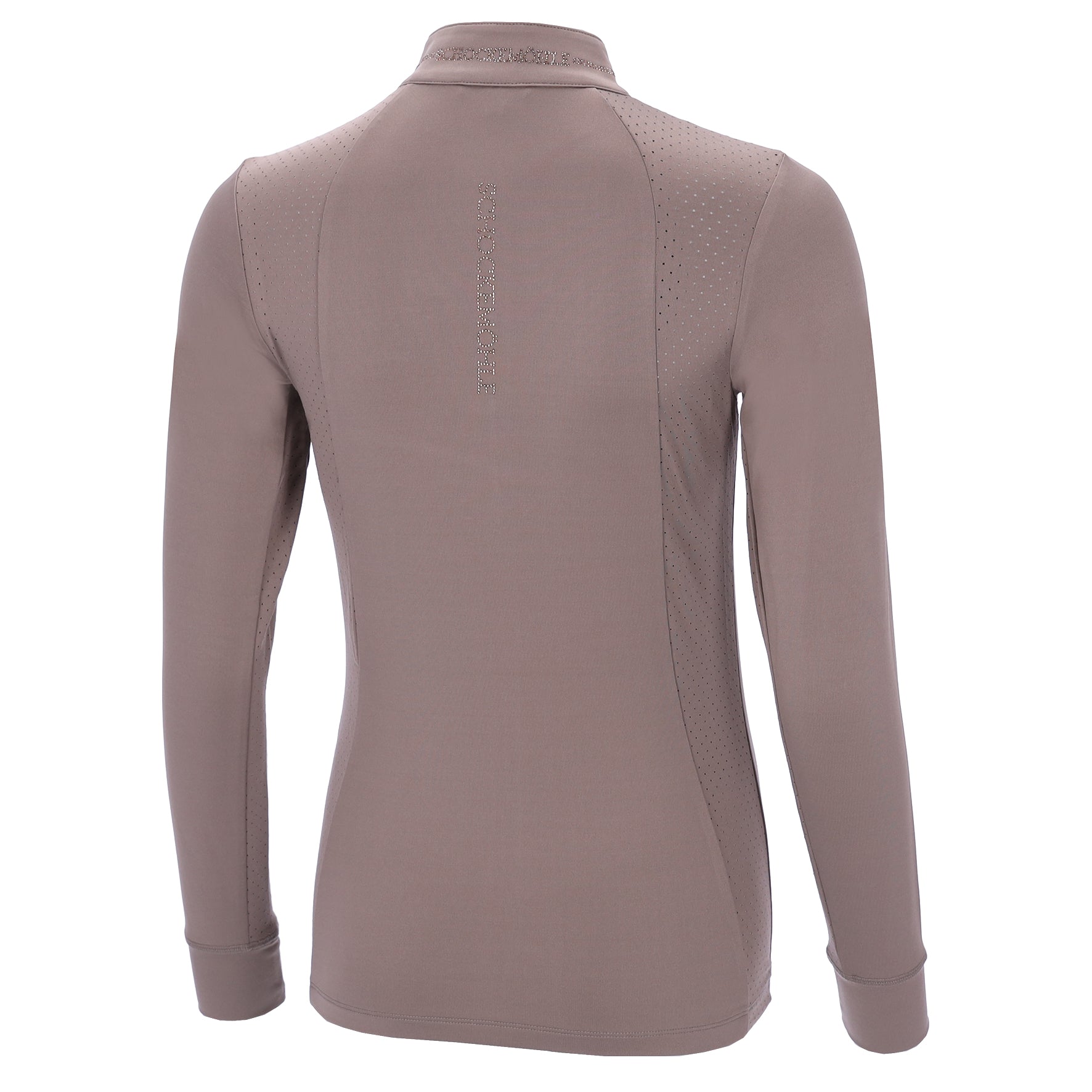 Chemise d’entraînement respirante pour femme | Manches 1/1 | inserts perforés dans le dos et sur le bas des manches | col montant avec strass | motif logo strass au dos | logo cheval en strass sur la poitrine et sur la manche